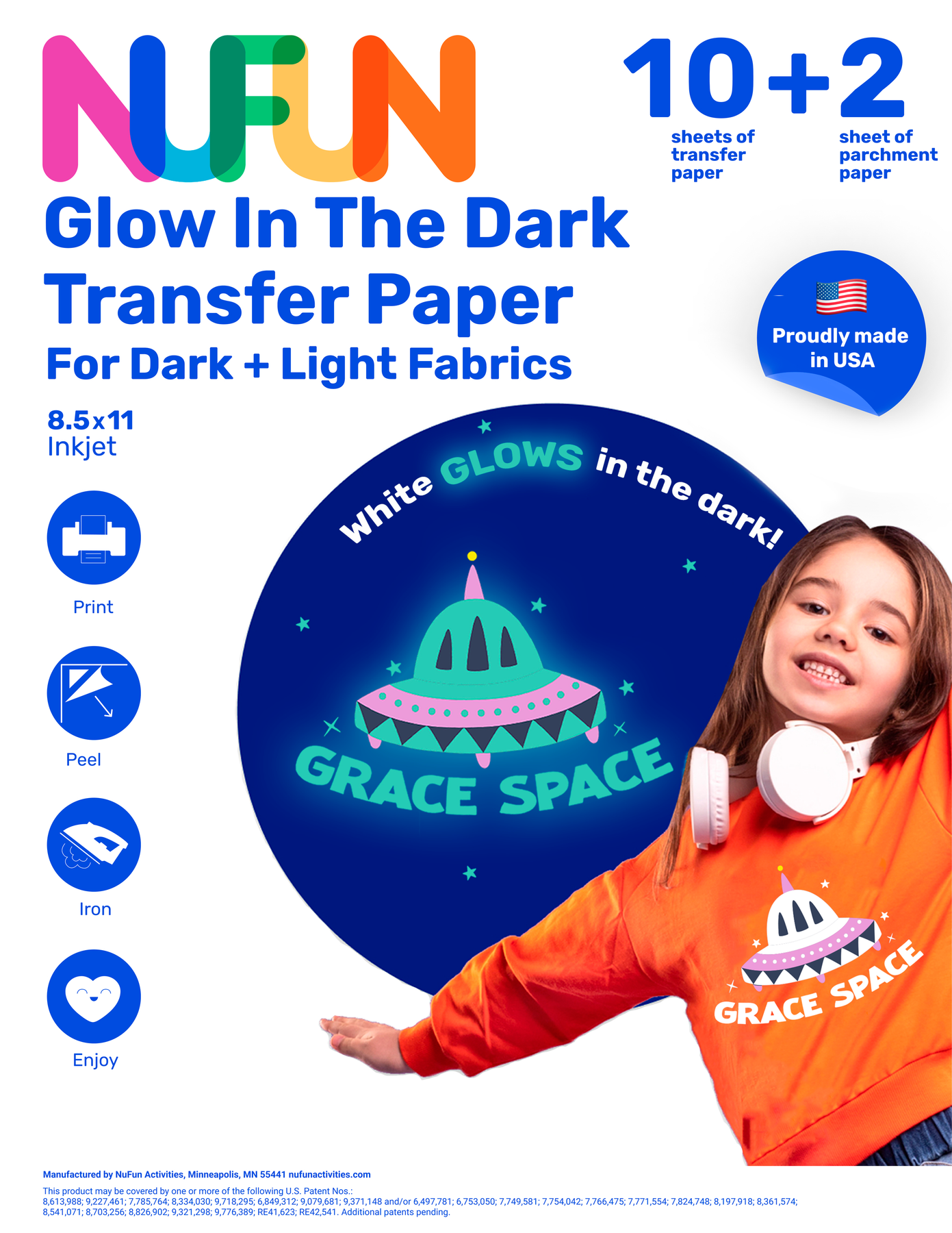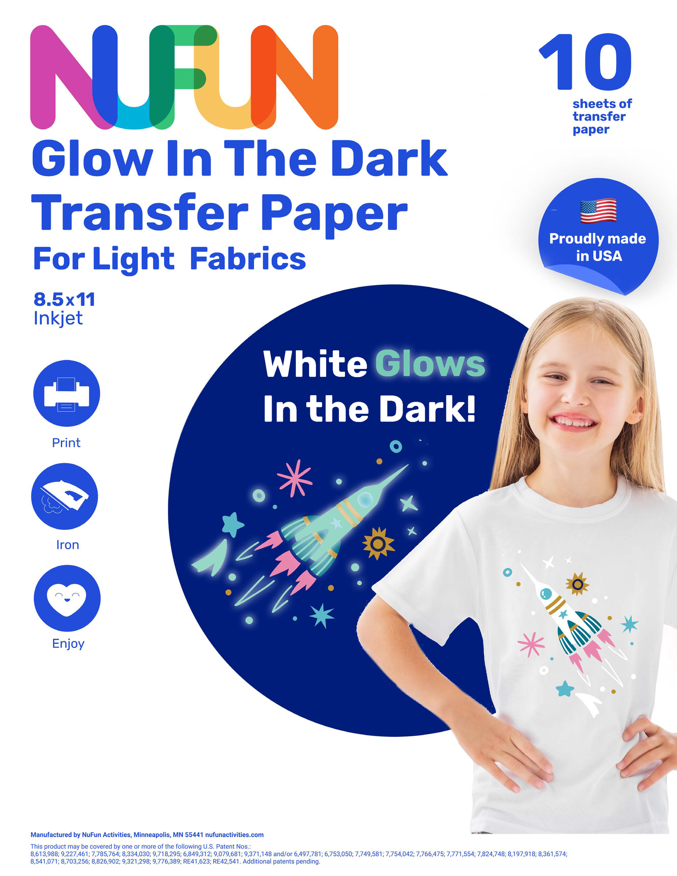 NuFun Activities Printable Glow in the Dark Transfer Paper includes our high-quality iron-on transfer papers for dark or light fabrics. Use them to create custom T-shirts, bags, hats, pillows and more! NuFun Activities brings the high-quality results that were previously only available to professionals to your home.